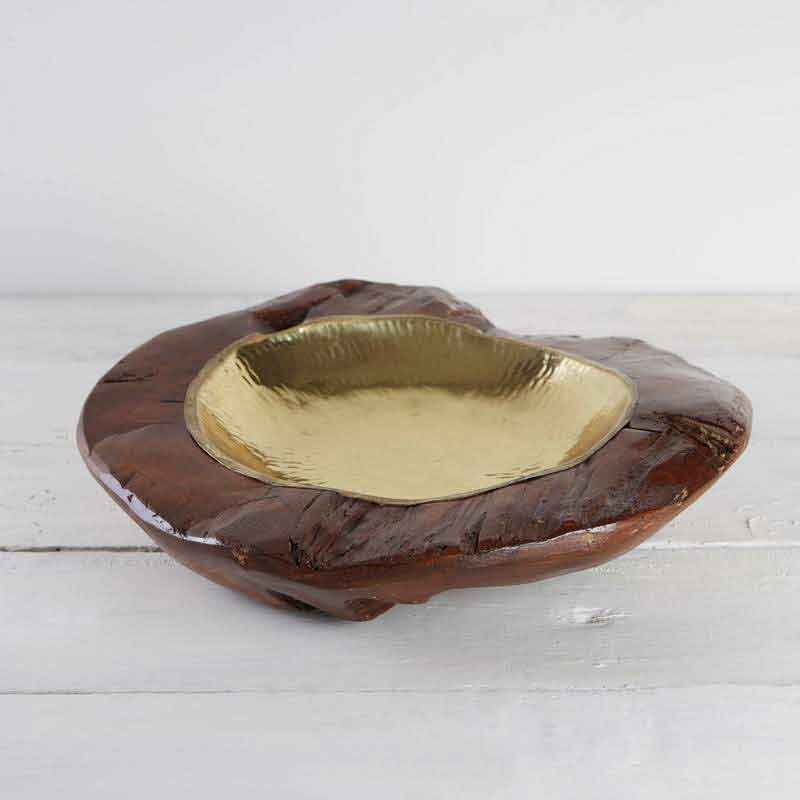 Prepare to captivate your guests with a decorative object that defies ordinary convention. This extraordinary bowl is a testament to sustainable and masterful craftsmanship, blending two opposing yet perfectly complementary materials: rugged, reclaimed wood and polished, textured brass. The outer shell is carved from a single piece of root wood, preserving the natural contours and deep, lustrous finish of the “live edge.” No two pieces are ever identical—the unique knots, fissures, and irregularities of the wood root ensure that your bowl is a one-of-a-kind sculpture shaped by time and nature.