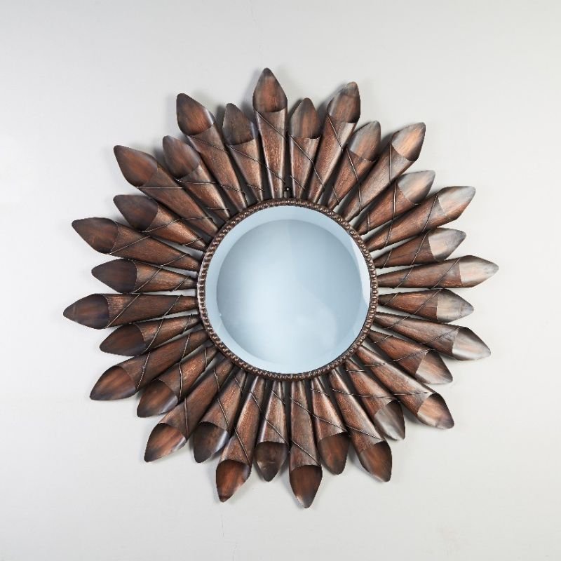 This dramatic decorative piece features a stunning torched metal frame crafted into a dynamic, layered sunburst or floral design. With its rich, rustic copper and bronze tones, this mirror serves as a powerful artistic focal point that brings texture and light to any living room, entryway, or bedroom.