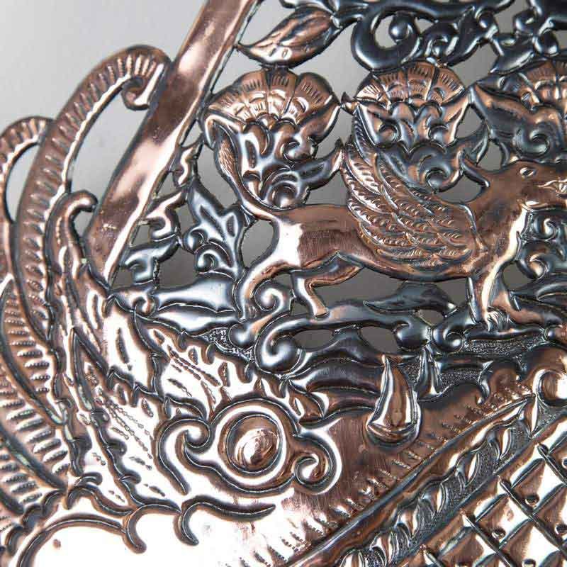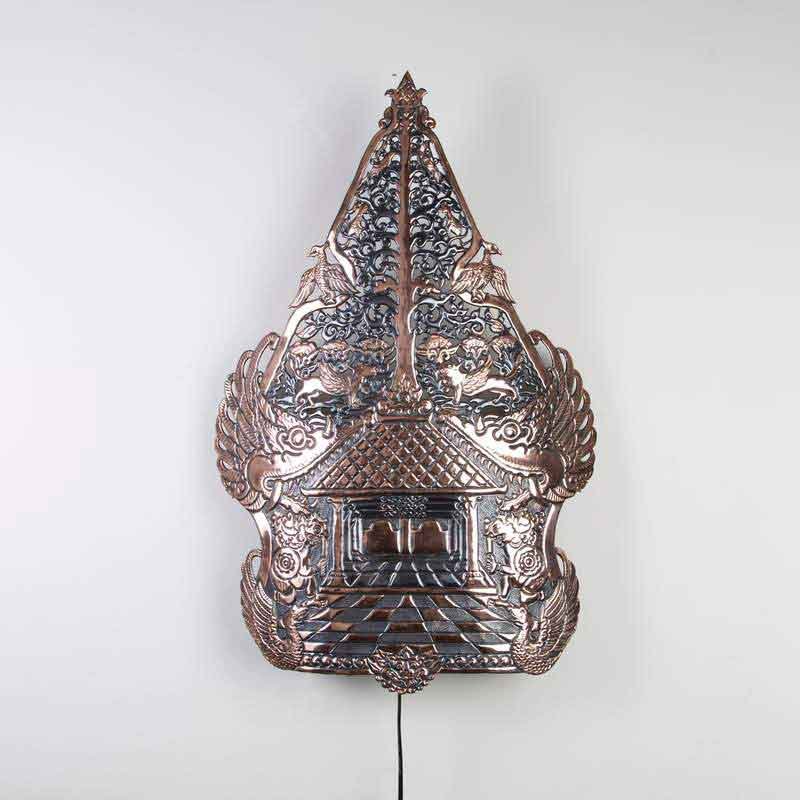 Crafted in a striking copper-and-dark-metallic finish, this relief is a stunning depiction of the Gunungan Gapuran (Gate Mountain). Look closely at the intricate carvings: at the base, you find the gapura (gate) guarded by two Buto (giants/demons), representing the threshold between the human and spiritual worlds. Above them, the winged creatures, foliage, and the central “Tree of Life” (Kalpataru) symbolize the entirety of the jungle, teeming with various aspects of human existence and wild nature. Display this powerful piece to inject a deep sense of cultural significance and sophisticated, philosophical beauty into your home, serving as a constant reminder of life’s eternal cycles and the balance between chaos and order.